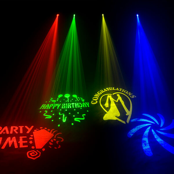 Этот универсальный проектор оснащен набором из четырёх сменных гобо-трафаретов разного типа (металлических и стеклянных), а также имеет четыре встроенных цветных фильтра (красный, желтый, зеленый, белый). Всё это даёт широкие возможности настройки визуального эффекта, включая изменение скорости вращения изображений вручную.