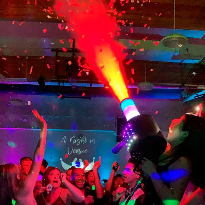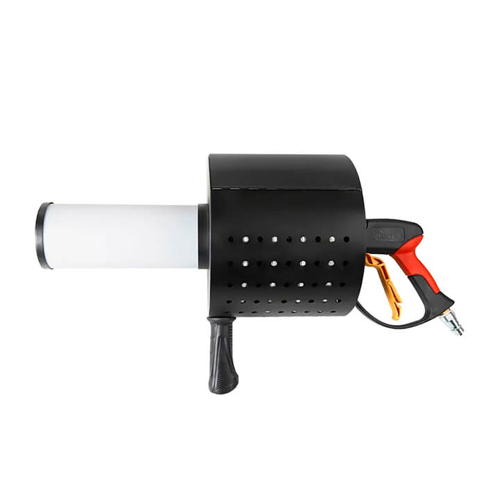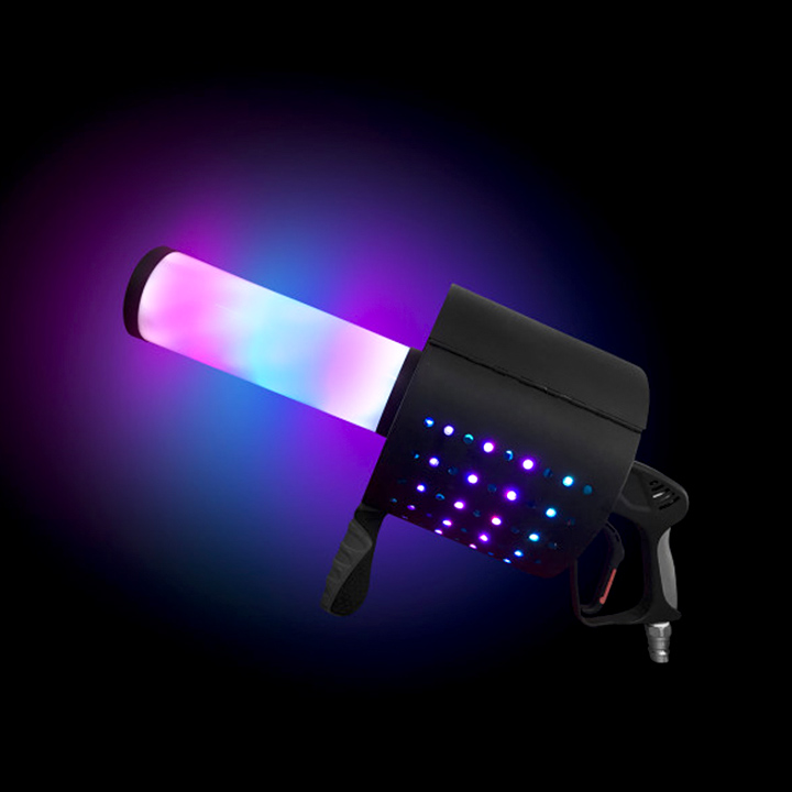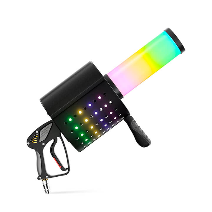Представляем LED-CO2 Confetti-gun, инновационное ручное устройство, которое метает конфетти и блестки за счет давления углекислого газа из внешнего баллона, подсоединенного шлангом высокого давления. Это новаторское устройство стало ярким событием праздничного сезона 2017/2018 годов, вызывая восторженную реакцию у самой разнообразной публики, включая взрослых, детей и профессионалов развлекательной индустрии. Его успех объяснялся не только впечатляющими визуальными эффектами, но и эргономичным дизайном, интегрированной LED-подсветкой, маневренностью и легкостью в обращении.Помимо простого выброса мелко нарезанной бумаги или целлофана, LED-CO2 Confetti-gun уникальным образом подсвечивает струю выходящего CO2, несущего декоративный материал. Это формирует совершенно новый гибридный спецэффект, эффективно сочетающий охлаждающее зрелище крио-пушки с взрывной мощью тяжелого конфетти-метателя. Ключевое режиссерское преимущество этой модели заключается в ее двойной функциональности: она позволяет производить как быстрые, дискретные выстрелы, так и продолжительные, непрерывные выбросы конфетти, предоставляя расширенный творческий контроль над постановкой представлений.
