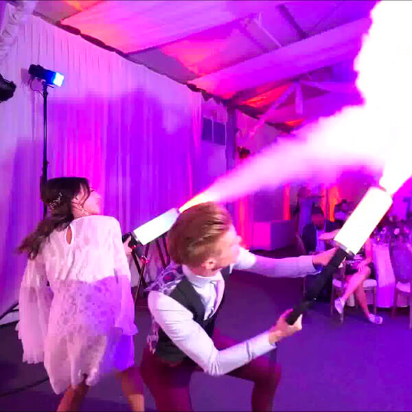 Устройство оснащается специальным рукавом высокого давления для присоединения баллонов с сухим льдом, что упрощает эксплуатацию и обслуживание. Длина выпускаемых потоков достигает внушительной дистанции до 8 метров, наполняя помещение густой иллюзией зимнего леса или космического пространства.