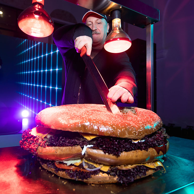 Организуем на вашем мероприятии представление с приготовлением огромного мега-бургера! Это кейтеринг шоу одновременно позволит развлечь гостей, поздравить виновника торжества и накормить гостей. Профессиональные повара на глазах зрителей будут собирать гигантский гамбургер по частям, плавить открытым пламенем сыр и подогревать мясную котлету.Преимущества такого выездного питания: