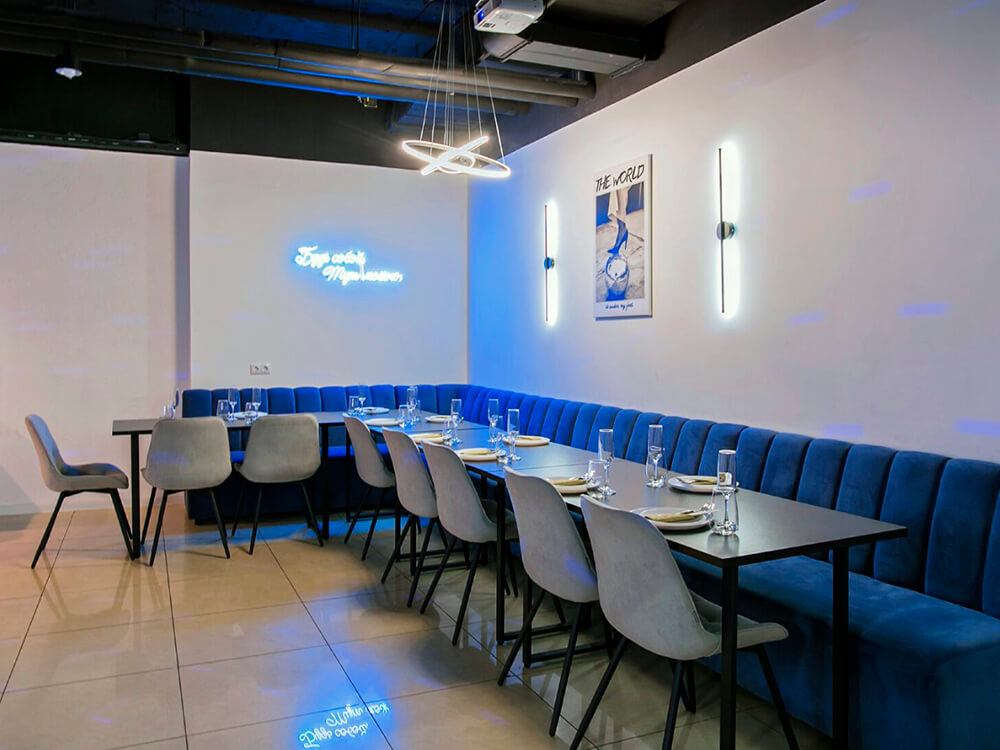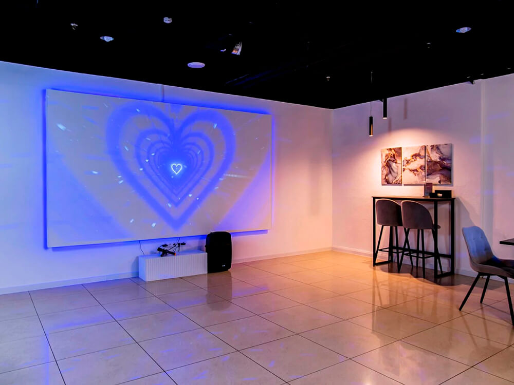 Зал GALLERY в Maybe Loft — это светлое пространство в бело-голубых тонах, оформленное картинами и фотозоной. Идеально подходит для мероприятий до 25 человек. Площадь зала — 40 кв.м. В стоимость аренды входят: проектор с экраном 3 м, колонка, диско-шар, караоке, фотозона, удобная мебель, посуда, уборка, возможность принести еду/напитки, настольные игры и бесплатный WI-FI, бесплатные 15 минут до начала мероприятия для подготовки.