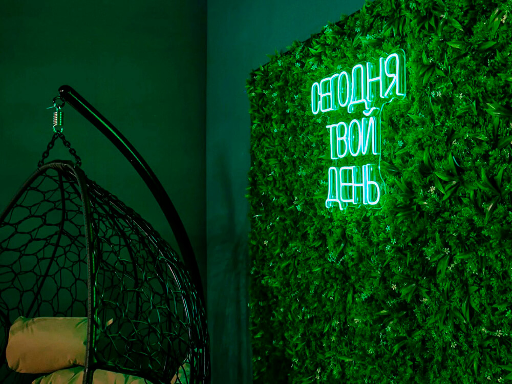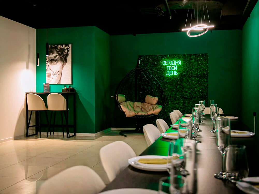 Зал GREENLAND в Maybe Loft — это уютное пространство в зеленых тонах, оформленное красивой фотозоной из фитостены с кресло-качалкой. Идеально подходит для мероприятий до 25 человек. Площадь зала — 55 кв.м. В стоимость аренды входят: проектор с экраном 3 м, колонка, диско-шар, караоке, удобная мебель, посуда, уборка, возможность принести еду/напитки, настольные игры и бесплатный WI-FI, бесплатные 15 минут до начала мероприятия для подготовки.