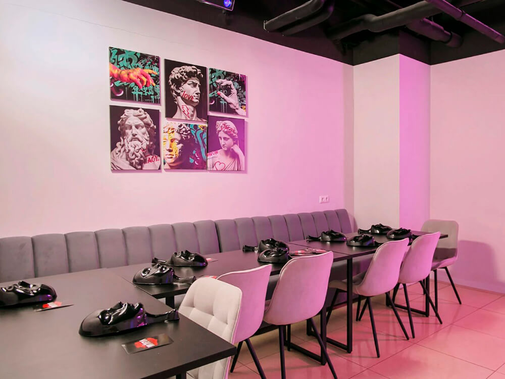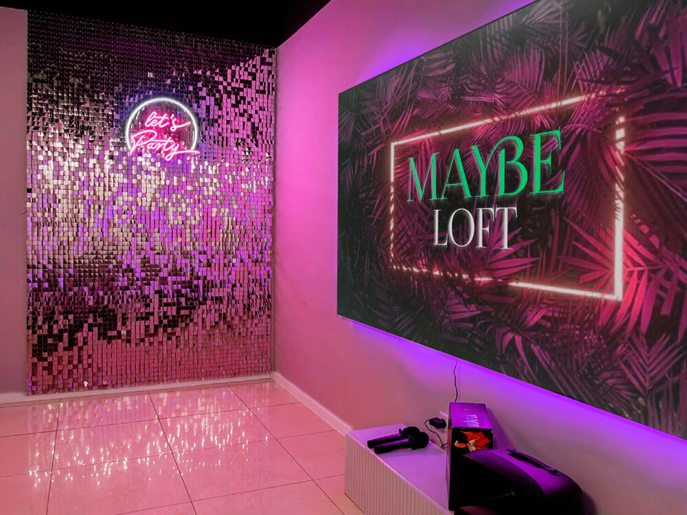Зал LITTLE PARTY в Maybe Loft — это уютное пространство для небольших компаний до 10 человек. Площадь зала — 20 кв.м. В стоимость аренды входят: проектор с экраном 3 м, колонка, диско-шар, караоке, фотозона, удобная мебель, посуда, уборка, возможность принести еду/напитки, настольные игры и бесплатный WI-FI, бесплатные 15 минут до начала мероприятия для подготовки.