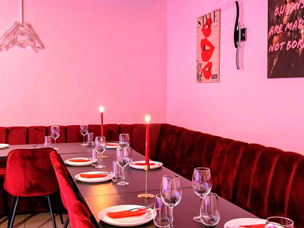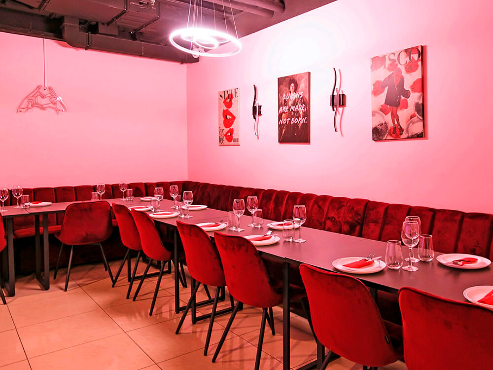 Зал Queen — это идеальное пространство для настоящих королев, оформленное в изысканных розово-бордовых тонах. Вместимость зала — до 25 человек, площадь — 40 кв.м. Стоимость аренды: Пн-чт — 2000 рублей/час, Пт-Вс — 2500 рублей/час, Сб с 10:00 до 17:00 — 2500 рублей/час, Сб с 17:00 до 5:00 — 3500 рублей/час. В стоимость входят: проектор с экраном 3 м, колонка, тв-приставка, диско-шар, светомузыка, караоке, фотозона, удобная мебель, посуда, уборка, возможность принести еду/напитки, настольные игры, бесплатный WI-FI, микроволновка и холодильник (через администратора), бесплатные 15 минут до начала мероприятия для подготовки.