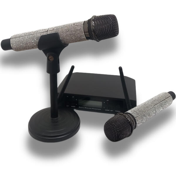 Предлагаются к приобретению два рабочих микрофона, декорированных россыпью блестящих камней. Такие аксессуары незаменимы для музыкальных видео и ярких шоу, ведь они не только выглядят эффектно, но и полностью пригодны для пения. Качественное покрытие кристаллами гарантирует яркую игру света и множество бликов от любого сценического освещения, включая динамические приборы и следящий свет.
