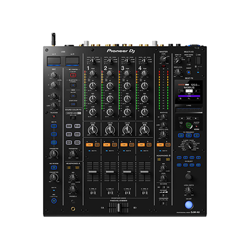 DJM-A9 — профессиональный DJ-микшер с 32-битными ЦАП/AЦП от ESS Technology, обеспечивает высокое качество звука (SNR 105 дБ). Фейдеры MAGVEL для идеальной точности микширования, 14 эффектов Beat FX и яркий экран для контроля. Поддерживает одновременное подключение двух ПК через USB, имеет Bluetooth, фантомное питание, два выхода для наушников. Совместим с rekordbox и Stagehand. Четыре канала, три полосы эквалайзера, кроссфейдер MAGVEL. Размеры: 407,4 × 458,3 × 107,9 мм, вес: 10,2 кг.