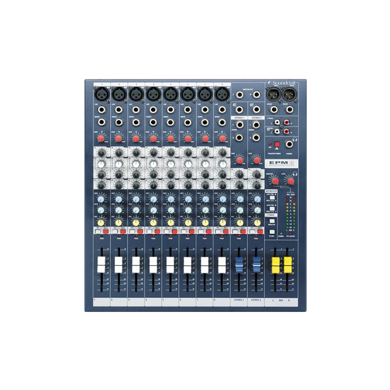 Soundcraft EPM 8 — это аналоговый микшерный пульт начального уровня, предназначенный для небольших концертных площадок, студий звукозаписи и мобильных диджей‑сетов.