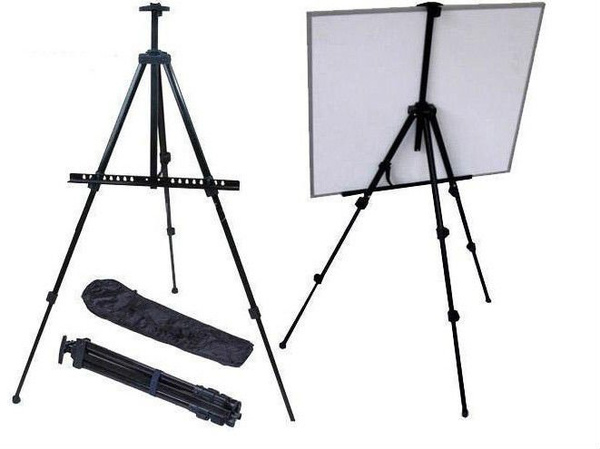 Складные металлические держатели для полотен представляют собой трехногие опоры универсального черного цвета, которые чрезвычайно компактны при перевозке и обеспечивают устойчивое размещение картин или фотографий. Прочная алюминиевая основа, дополненная функциональной полкой, быстро упаковывается в прилагаемый матерчатый футляр, предназначенный для удобства хранения и перемещения. Высота этих мольбертов легко корректируется непосредственно на месте проведения мероприятия благодаря их телескопической конструкции. Разборные подставки-мольберты идеально подходят для краткосрочного использования на художественных или фотовыставках, особенно в локациях, где запрещено традиционное крепление экспонатов к стенам. Благодаря своему строгому, но элегантному оформлению, эти раскладные мольберты остаются востребованными и простыми в эксплуатации.
