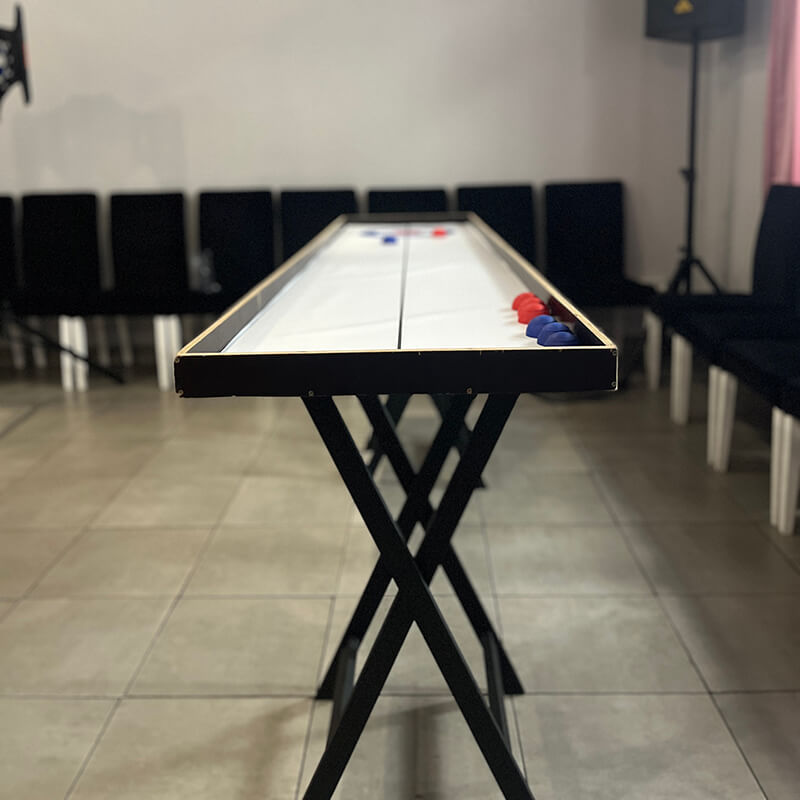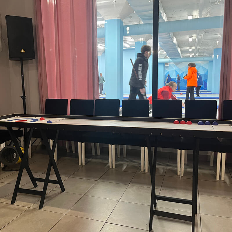 Настольный керлинг — это увлекательная игра, которая доступна для аренды. В ней используются те же правила, эмоции и тактики, что и в традиционном керлинге. Благодаря компактным размерам, настольный керлинг легко разместить на любой площадке, что делает его идеальным развлечением для вечеринок.
