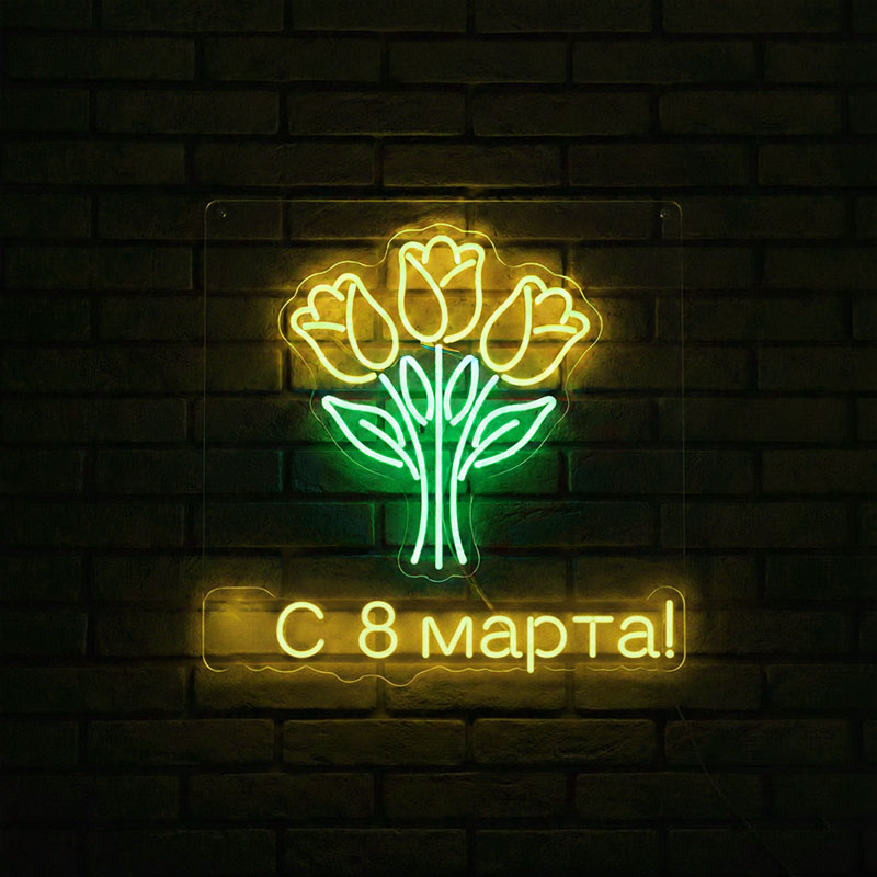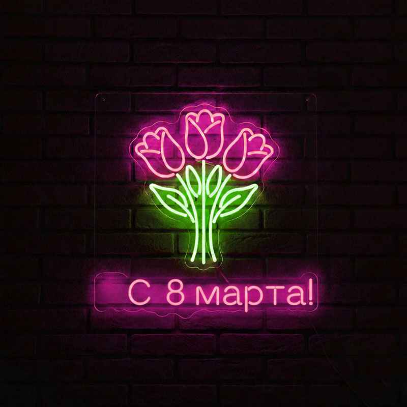 Создадим неповторимую неоновую вывеску к 8 марта — она станет ярким акцентом праздничного интерьера и подарит теплые эмоции! Мы воплотим в сияющем неоне любые пожелания: нежные цветочные мотивы, изящные надписи с поздравлениями, символичные силуэты или абстрактные узоры. Каждый элемент изготавливается индивидуально — от эскиза до финальной сборки.