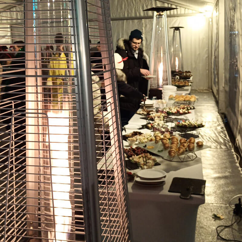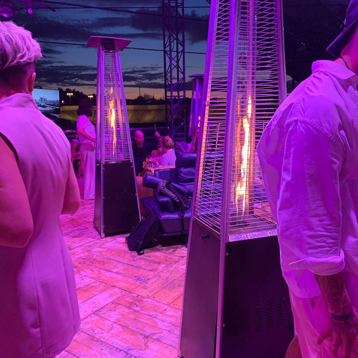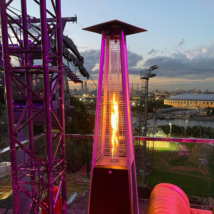 Уличный газовый обогреватель в виде пирамиды, изготовленный из высококачественной стали, имеет красивый дизайн и выглядит симпатично по отдельности. А в ночное время суток он создаст волшебную атмосферу.