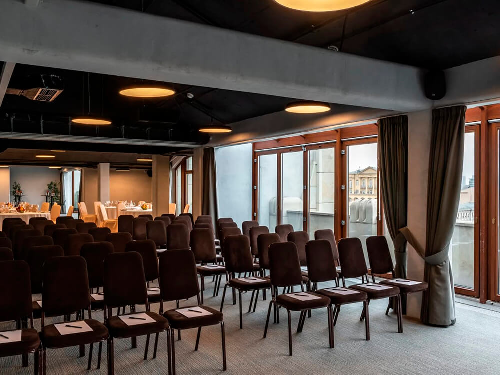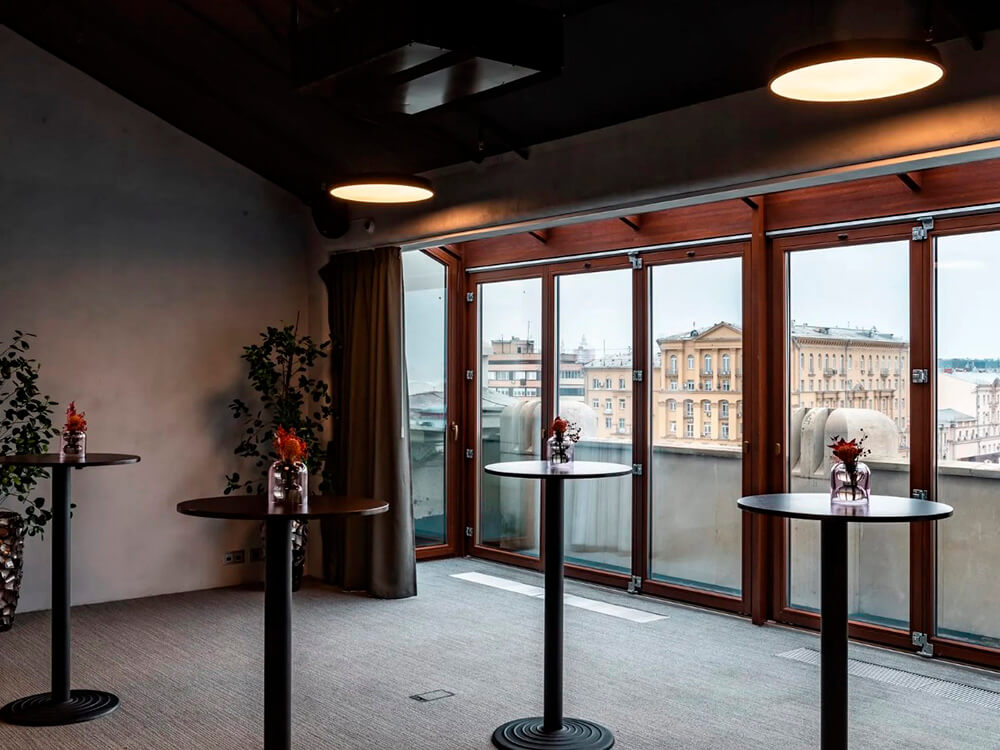 Идеальное пространство для мероприятий и торжеств в Москве. Современный дизайн в стиле лофт, площадь 194 м², трансформируемый на 3 зала. Стильный декор с графитовым полом и стенами, глубокие черные потолки подчеркнуты уникальной системой освещения. Окна в пол наполняют зал естественным светом. Технические возможности включают кондиционер, аудиосистему, высокоскоростной интернет и медиапанель 3х4 м. Дополнительно предоставляются флипчарт, бар и необходимое оборудование.
