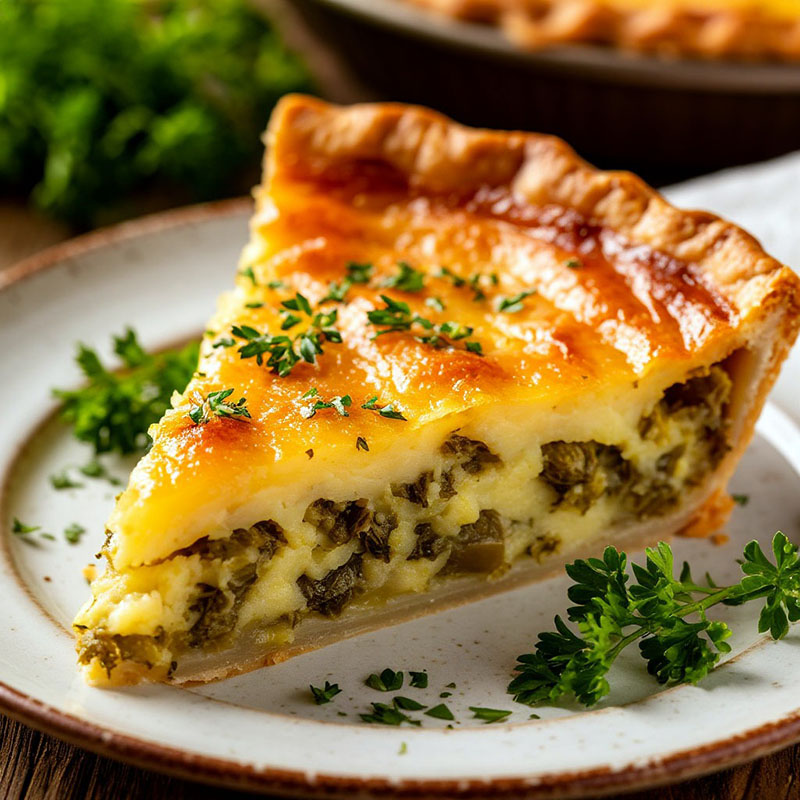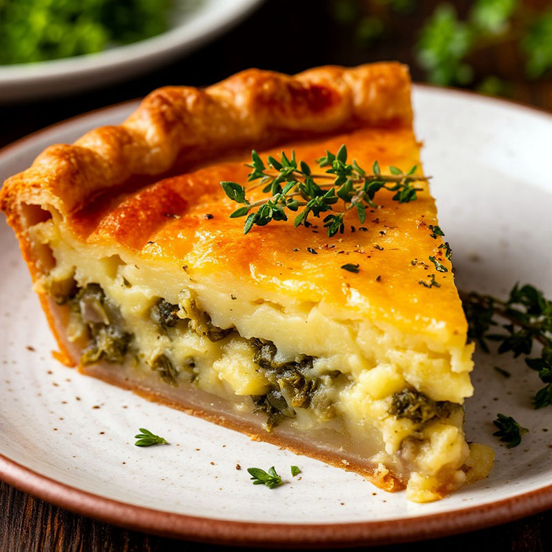 Сбалансированный вкус без излишней остроты или яркости делает пирог универсальным. Свежая зелень добавляет легкую пикантность и визуальную привлекательность, а сытность картофеля исключает необходимость в дополнительных закусках. Удобная порционная подача упрощает сервировку и подходит для формата фуршета.