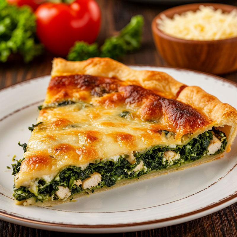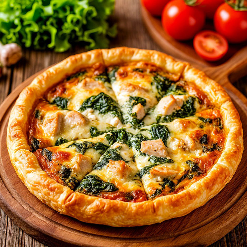 Блюдо с высокой питательной ценностью и нейтральным вкусовым профилем. Курица обеспечивает сытность, шпинат добавляет легкую свежесть, а сыр создает приятную тягучесть. Пирог легко нарезается на ровные порции, сохраняет температуру и презентабельность в течение всего мероприятия, подходит для массового обслуживания.