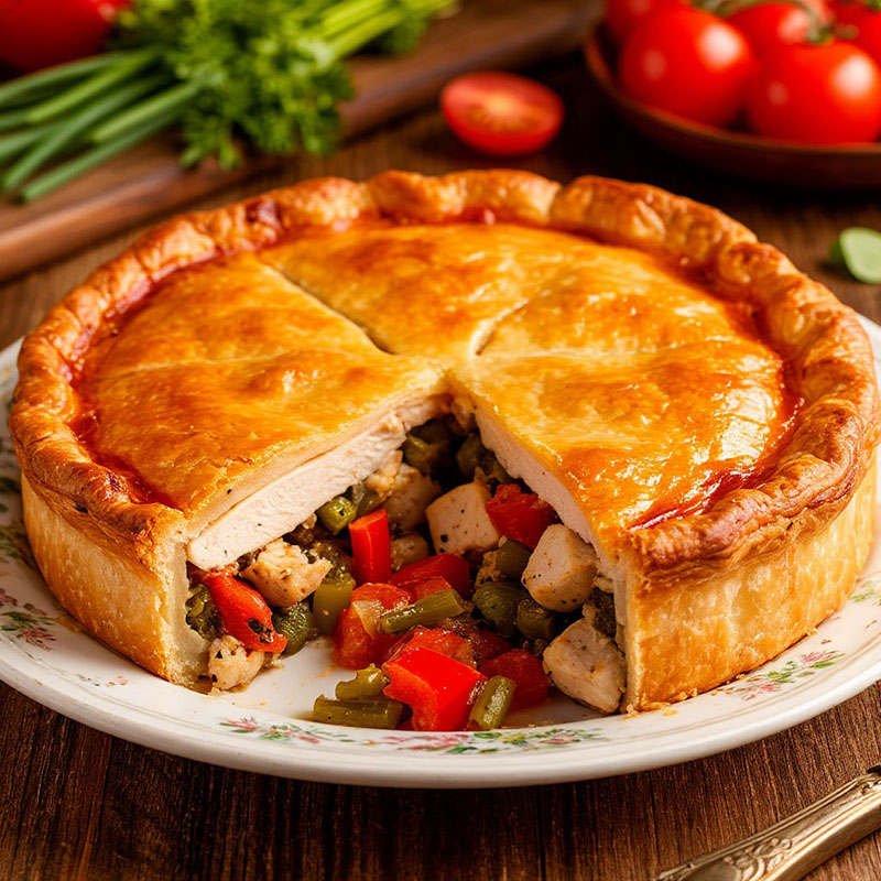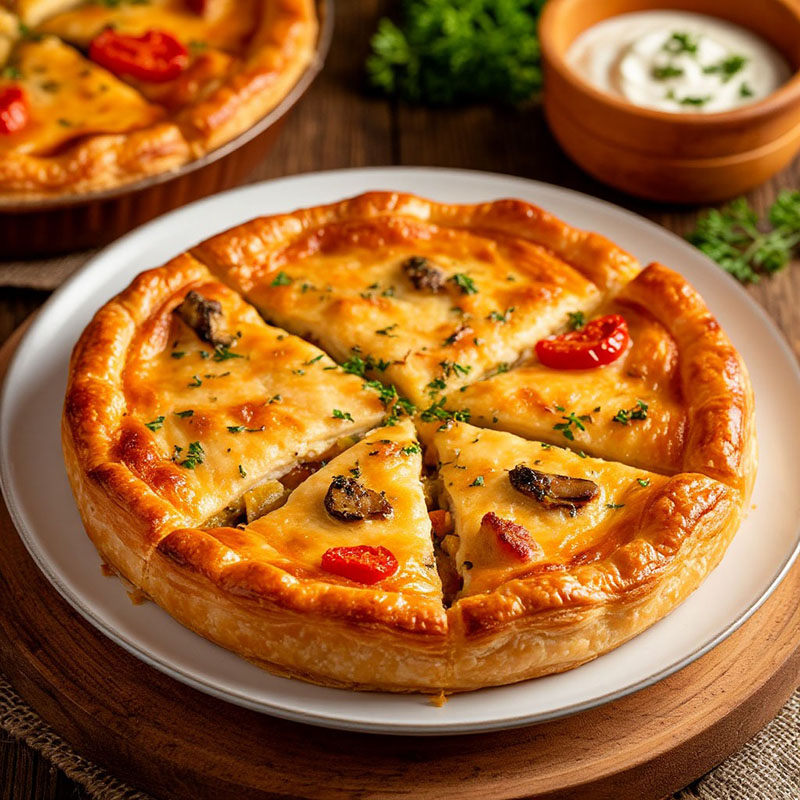 Этот пирог покорит гостей с первого кусочка: внутри — сочная курица и аппетитные овощи, запеченные до легкой карамельной корочки. Тесто получается хрустящим снаружи и нежным внутри, а сочетание пряных трав и дымных нот от гриля создает неповторимый аромат. Блюдо смотрится эффектно на любом столе и отлично подойдет как для торжественного случая, так и для дружеской встречи.