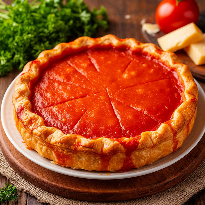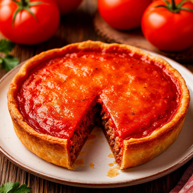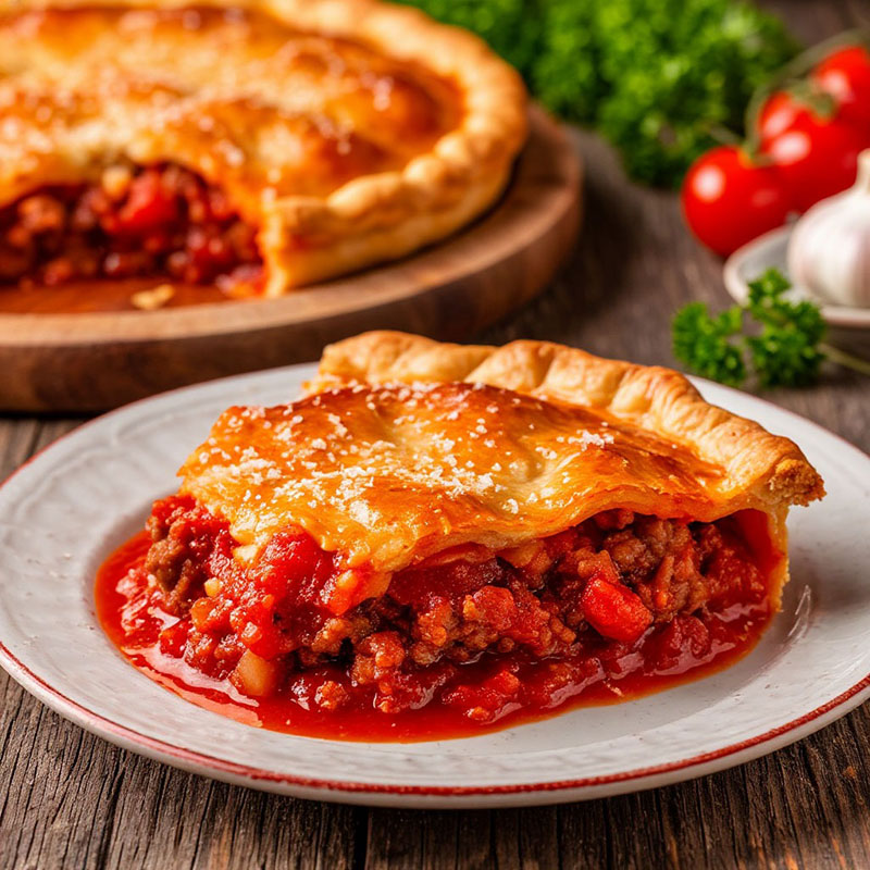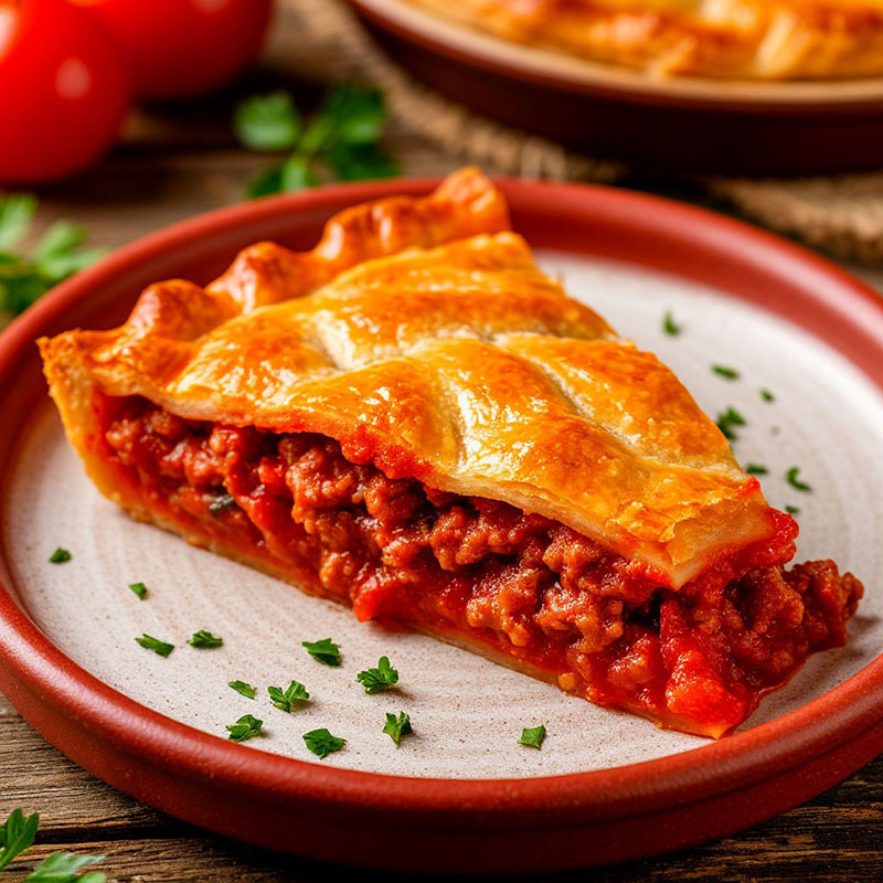 Настоящая находка для любителей сытных блюд: нежное тесто обрамляет сочную мясную начинку, пропитанную насыщенным томатным соусом с пряными нотками. Сверху — аппетитная румяная корочка из расплавленного сыра, которая тянется при разрезании и манит своим ароматом. Блюдо выглядит празднично, отлично держит форму при подаче и способно стать центральным элементом стола.