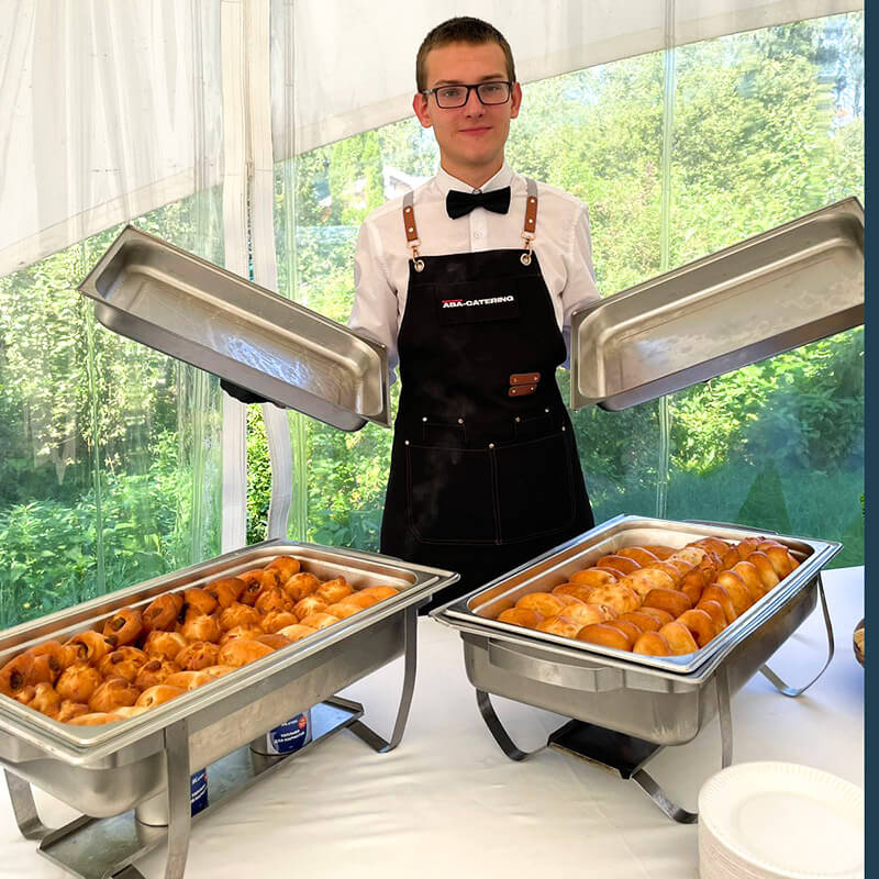Это отличное решение для утреннего фуршета, если ваш праздник начинается с раннего утра, нет ничего лучше чем чай и кофе с горячими пирожками. Тем более, если у вас есть собственный персонал, который нужно накормить в течении мероприятия.