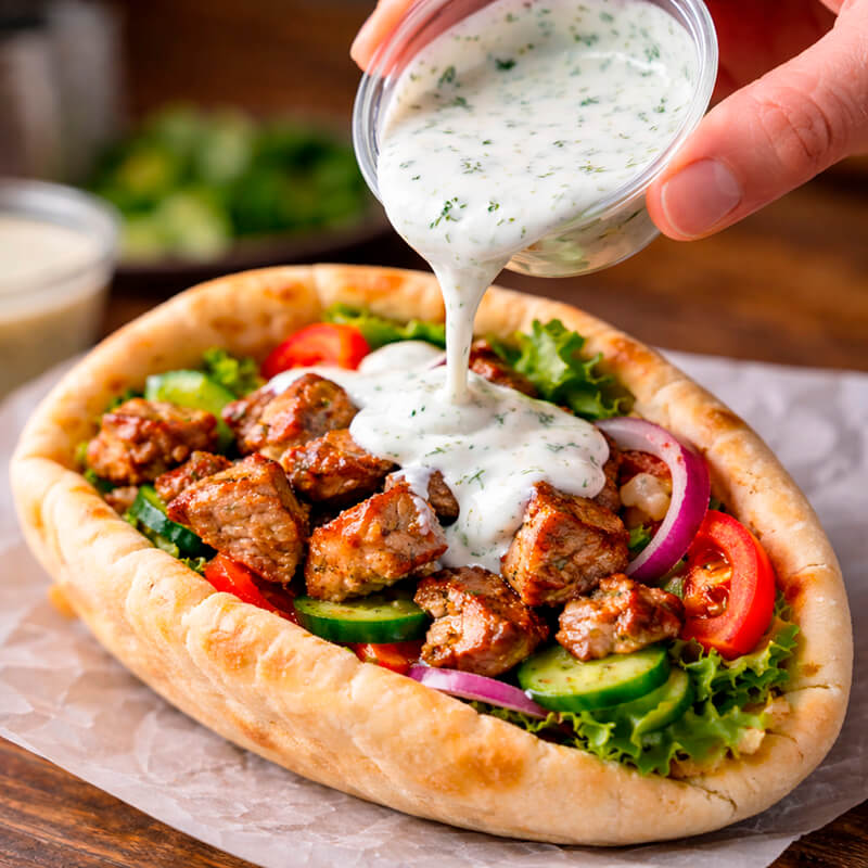 Пита с говядиной: гГовядина, салат китайский, лук, огурцы маринованные, огурцы свежие, соус чесночный, соус томатный, соус сырный, лук жареный. .