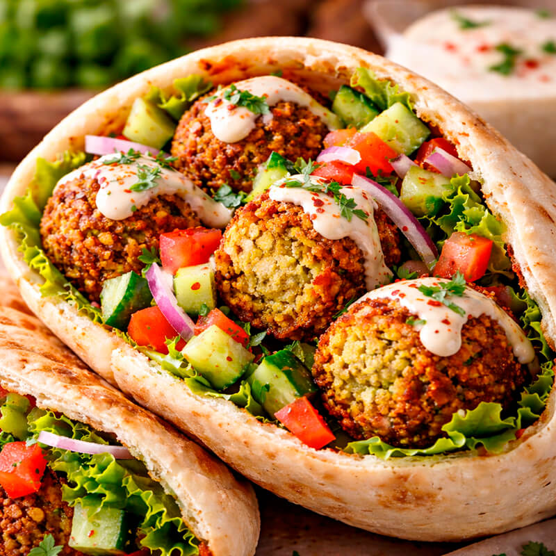 Пита с фалафелими: обжаренный фалафель в Пите с соусом тахина и свежими овощами.
