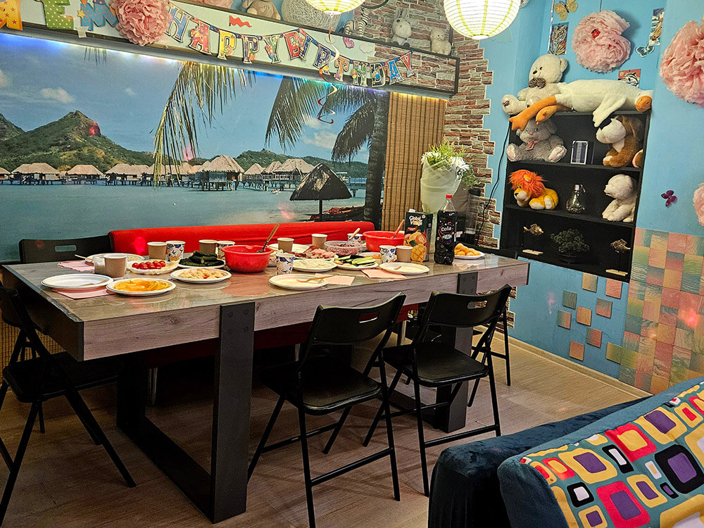 Лофт «Планета праздника» в Химках — уютное пространство для мероприятий общей площадью 109 м². Два зала: банкетный (до 15 человек) и игровой (до 30 человек). Во время вашего праздника лофт закрыт для посторонних, а между мероприятиями проводится уборка. В игровом зале есть фотозона с пайетками, а также можно заказать шары и пиньяту. Еду и напитки можно принести или заказать доставку, торт — свой или от нашего кондитера. Посуду можно арендовать у нас. Лофт оборудован холодильником, микроволновкой, чайником, кулером, телевизором, x-box, диско шарами, лазерами, стробоскопами и неоновым освещением для создания праздничной атмосферы.
