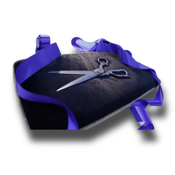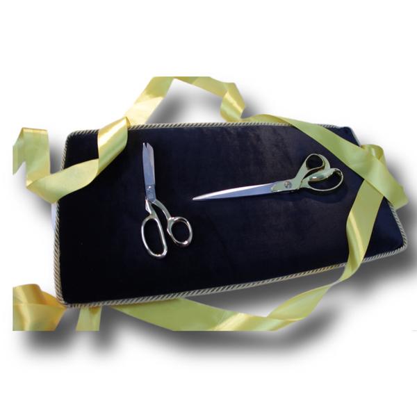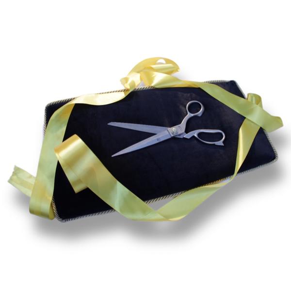 Подчеркните статус вашего торжественного события с помощью этой подушки-подноса. Эффектное сочетание глубокого черного цвета с яркой желтой бахромой по контуру и аккуратными кисточками на углах создаст праздничную атмосферу. Верх и низ изделия отделаны бархатом, чья мягкая ворсистая текстура специально продумана для того, чтобы инструмент для перерезания ленты устойчиво лежал на поверхности, не скользил и был надежно зафиксирован.