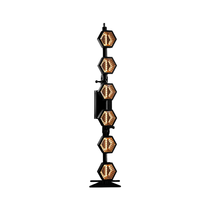 Portman P2 Hexaline — это сценический световой прибор с ретро-дизайном, состоящий из шести вертикально расположенных ячеек с галогенными лампами. Каждая ячейка может управляться индивидуально, что позволяет создавать разнообразные световые эффекты. Прибор отличается гибкостью благодаря шарнирам после каждой пары ячеек, что позволяет менять угол наклона и создавать различные конфигурации.