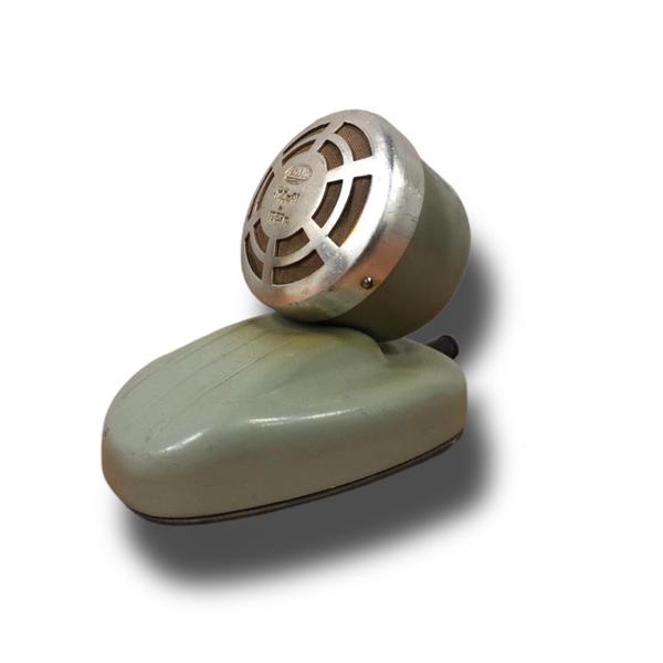 Изделие, произведенное в 1957 году, имеет тяжелую подставку и характерный провод с текстильной изоляцией для подключения к усилителю. Схожие модели активно применялись в советскую эпоху на спортивных аренах, в радио-рубках пионерских лагерей и ДК. Иногда поставлялся как часть набора с магнитофоном на электронных лампах.