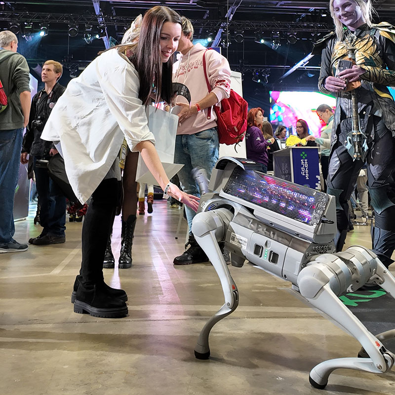Современный четвероногий робот обладает плавной походкой, способностью преодолевать препятствия и выполнять эффектные движения. Устанавливаемый LED‑экран отлично подходит для демонстрации логотипа и слогана компании, приветственных сообщений или названия мероприятия.