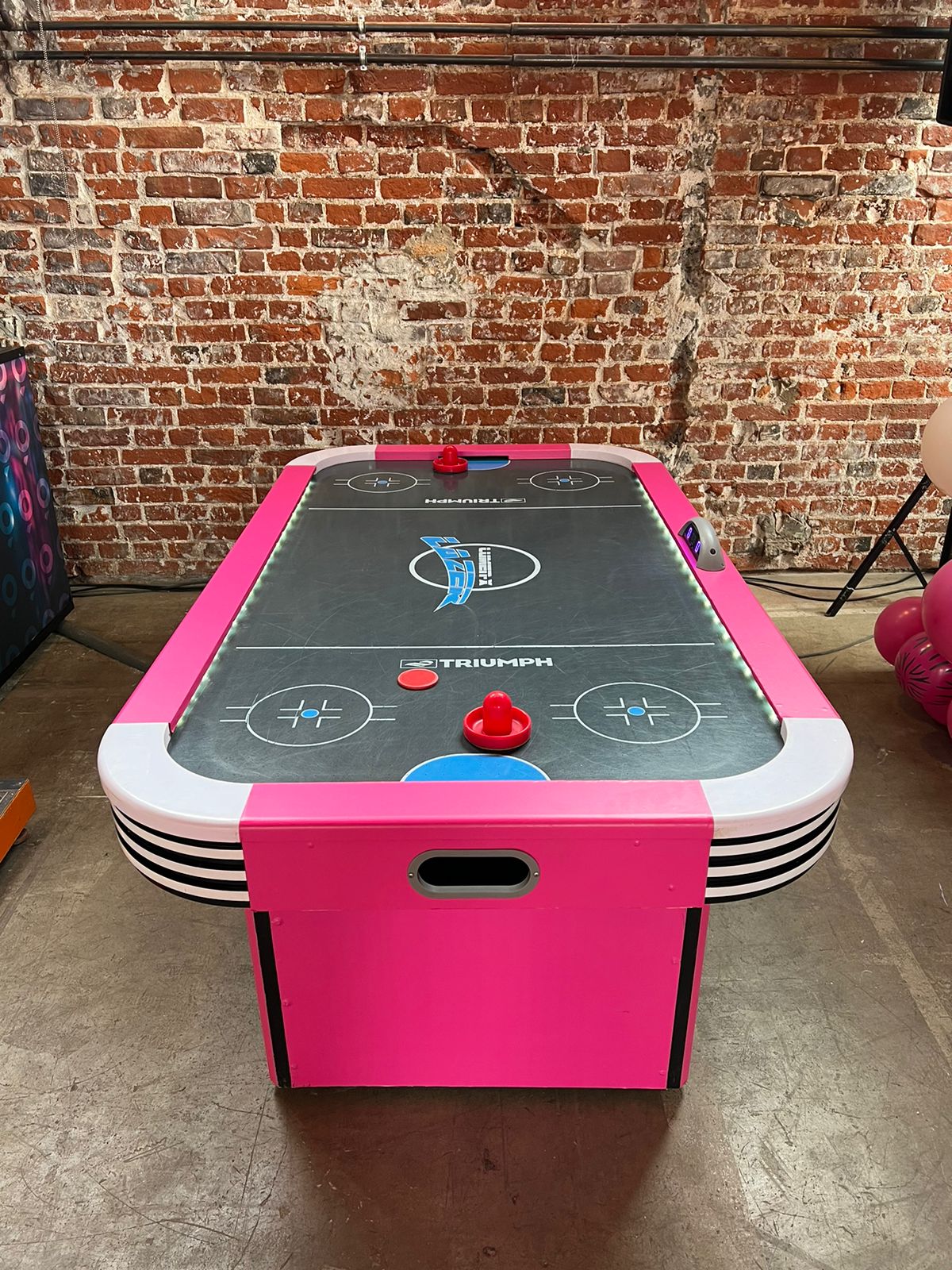 Аэрохоккей – популярная игра во всем мире, которая подходит для людей всех возрастов. Мы предлагаем украсить ваше мероприятие, посвященное 14 февраля или 8 марта, аэрохоккеем в розовом цвете, что дополнительно подчеркнет атмосферу праздника. В комплекте с игровым столом идут две специальные биты и две шайбы.