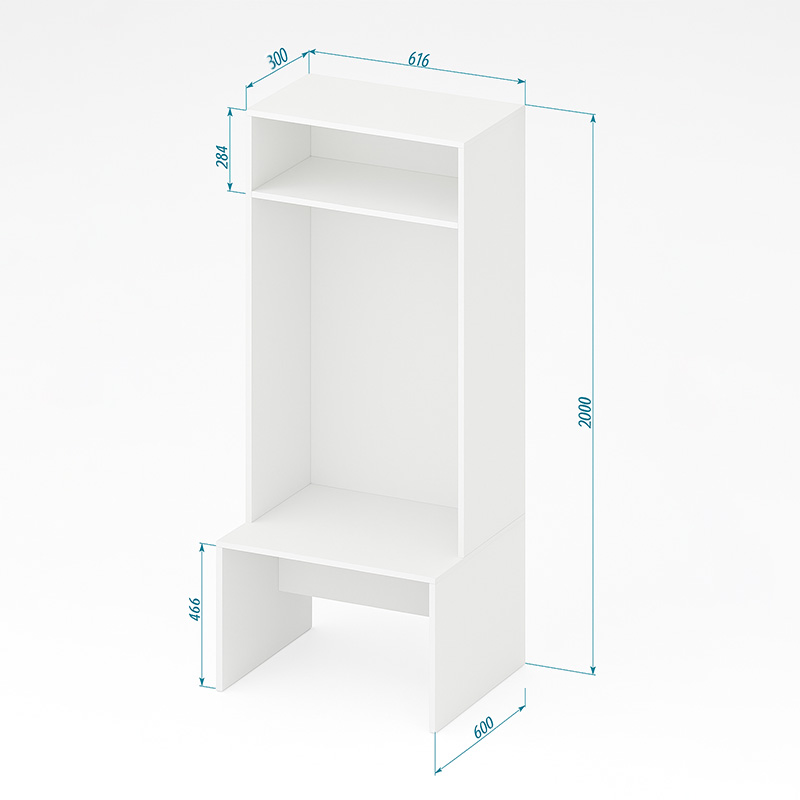 Верхняя часть — это высокий отсек с одной горизонтальной полкой, предназначенной для размещения одежды или других вещей. Внутри отсека также имеется металлический крючок, который можно использовать для подвешивания одежды, сумок или аксессуаров.
