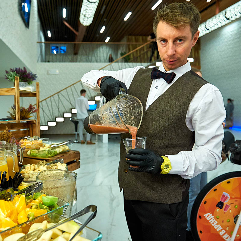 Закажите смузи-бар на мероприятие — свежий и полезный формат, который особенно оценят сторонники здорового питания. Яркие вкусы, натуральные ингредиенты и заряд витаминов сделают его идеальным решением в любое время года, особенно зимой. Требования к питанию: 2 кВт.