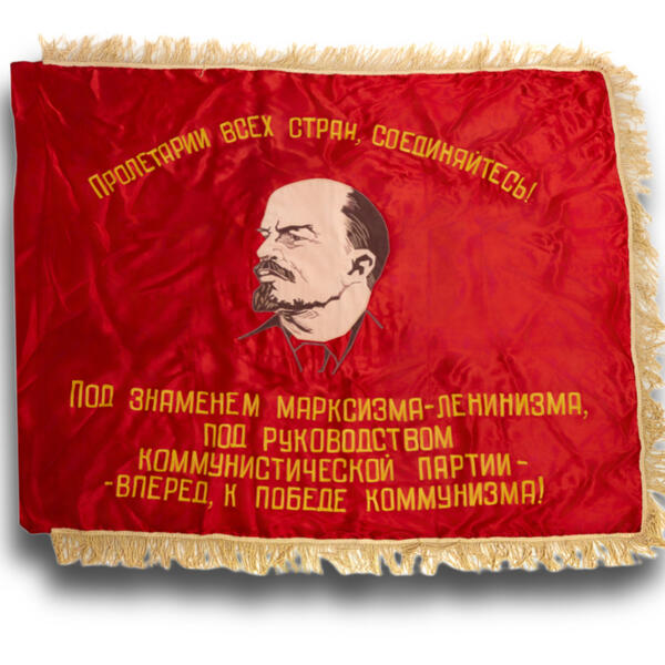 Полотно алого цвета, выполненное из двух слоев бархатной ткани и декорированное по периметру бахромой желтого оттенка, несет на себе лик В.И. Ленина и начертанный лозунг: "Под знаменем Марксизма-Ленинизма под руководством коммунистической партии - вперед к победе коммунизма!".