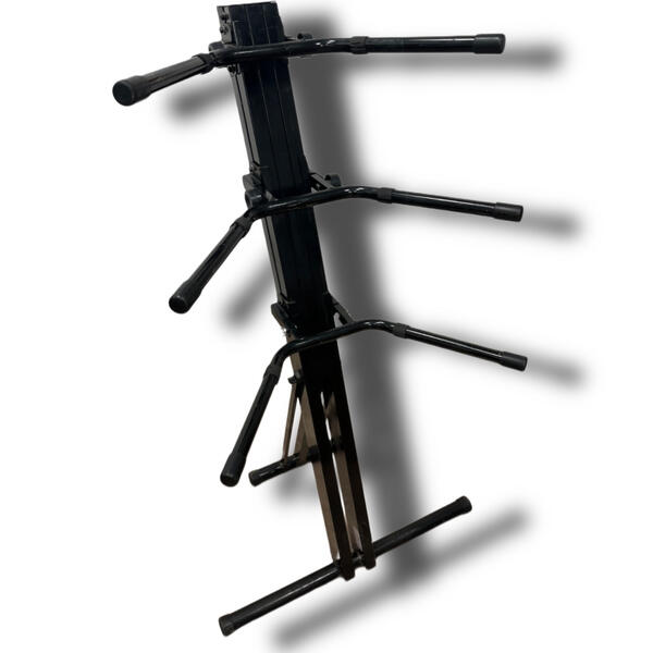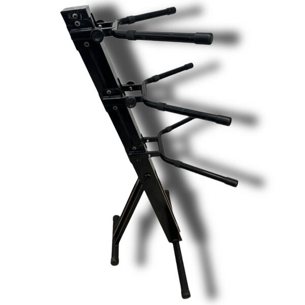Когда для выступлений требуется надежная и вместительная подставка, мы используем нашу мощную трехполочную стойку, которая без проблем выдерживает вес сразу трех синтезаторов. Ее ключевое преимущество — элементарная сборка: V-образные трубчатые держатели для каждой полки просто вставляются в пазы и затягиваются двумя удобными винтовыми ручками, обеспечивая надежную фиксацию каждого уровня.
