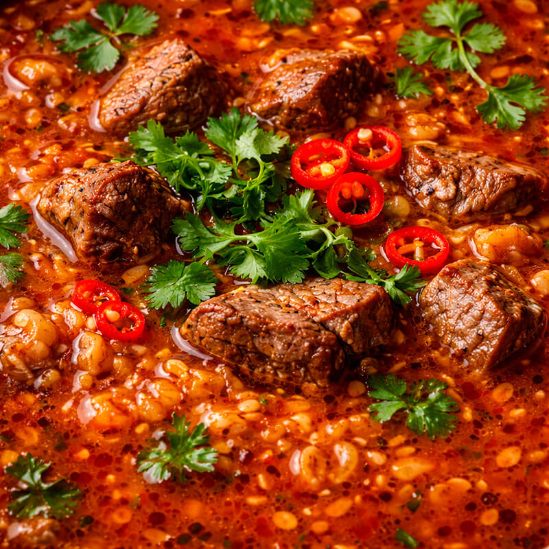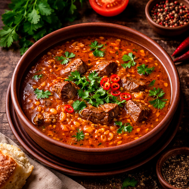 Харчо — традиционный грузинский суп, приготовленный на основе ароматного мясного бульона с добавлением риса, насыщенных специй и особого соуса, придающего блюду приятную кислинку. Классический рецепт предполагает использование говядины, однако мы предлагаем разнообразные варианты приготовления с использованием курицы или свинины.