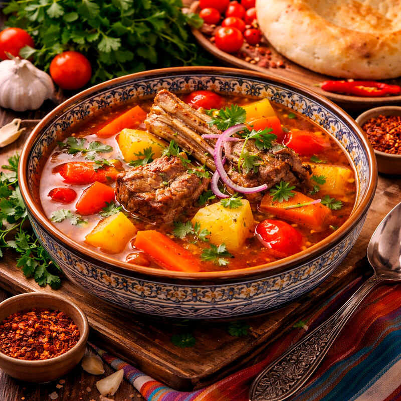 Шурпа — традиционный восточный суп, знаменитый своим глубоким ароматом и насыщенным вкусом. Этот густой суп готовится на крепком мясном бульоне, украшен крупными кусочками свежих овощей и минимальной дозировкой специй, позволяя раскрыть истинный вкус мяса и свежей зелени. Классический рецепт предполагает использование баранины, хотя возможны и альтернативные версии с говядиной либо курицей.