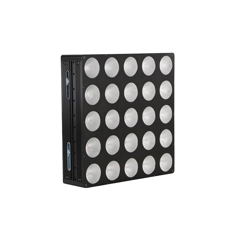 Светодиодный RGB блайндер, предназначенный для профессионального использования в освещении сцен, театров, клубов, баров и других площадок. Прибор оснащен 25 светодиодами мощностью 9 Вт каждый (RGB мультичип COB) и имеет угол раскрытия луча 55°. На задней панели расположены разъёмы для подключения и кнопки управления. Конструкция позволяет крепить несколько блайндеров между собой.