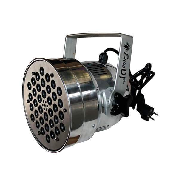 Светодиодный прожектор EURO DJ LED PAR 64 — профессиональный прибор для создания уникальной атмосферы на мероприятиях разного уровня. Оснащён 36 светодиодами трёх цветов (RGB), мощность каждого 1 Вт, угол рассеивания 45°. Управление осуществляется в автоматическом режиме, по звуку или через протокол DMX512. Габариты: 160 × 160 × 230 мм, вес — 2 кг. Изготовлен из легкосплавного металла, ресурс работы светодиодов — более 50 000 часов. Идеален для концертов, клубов, театральных постановок и праздников.