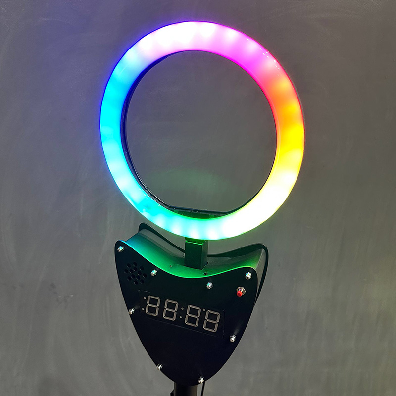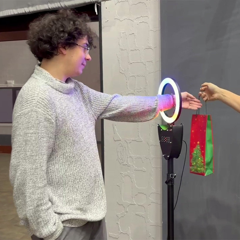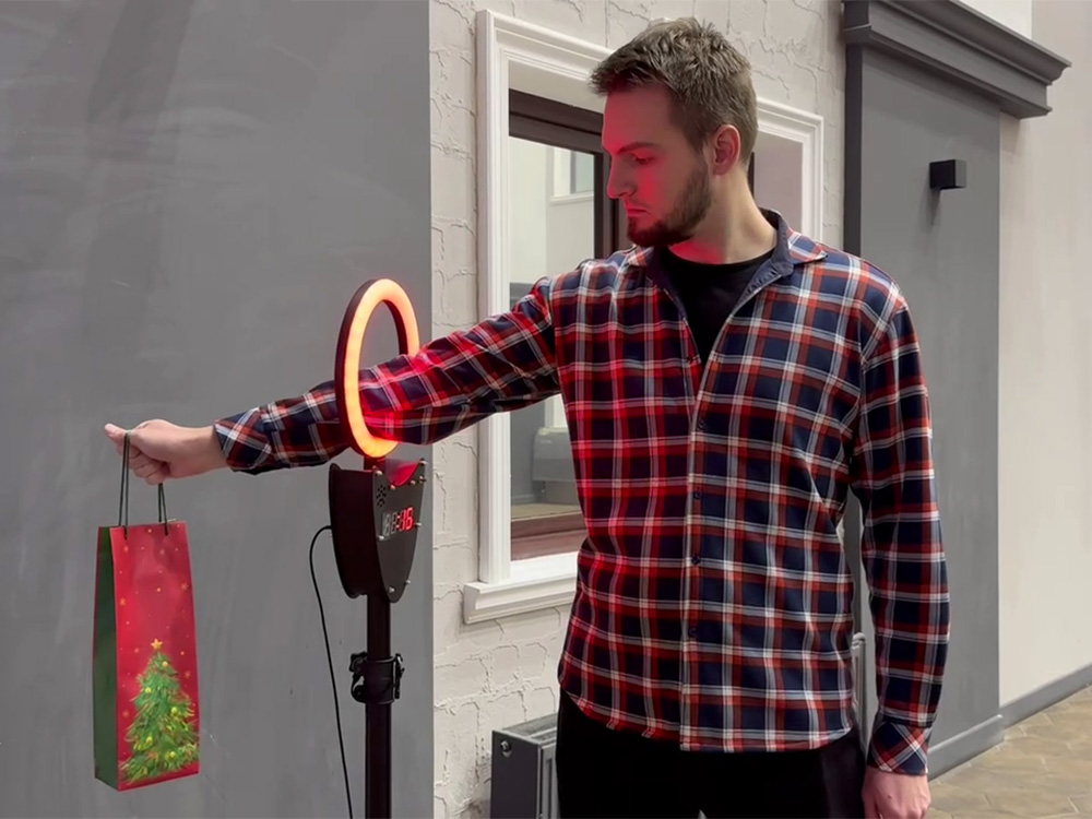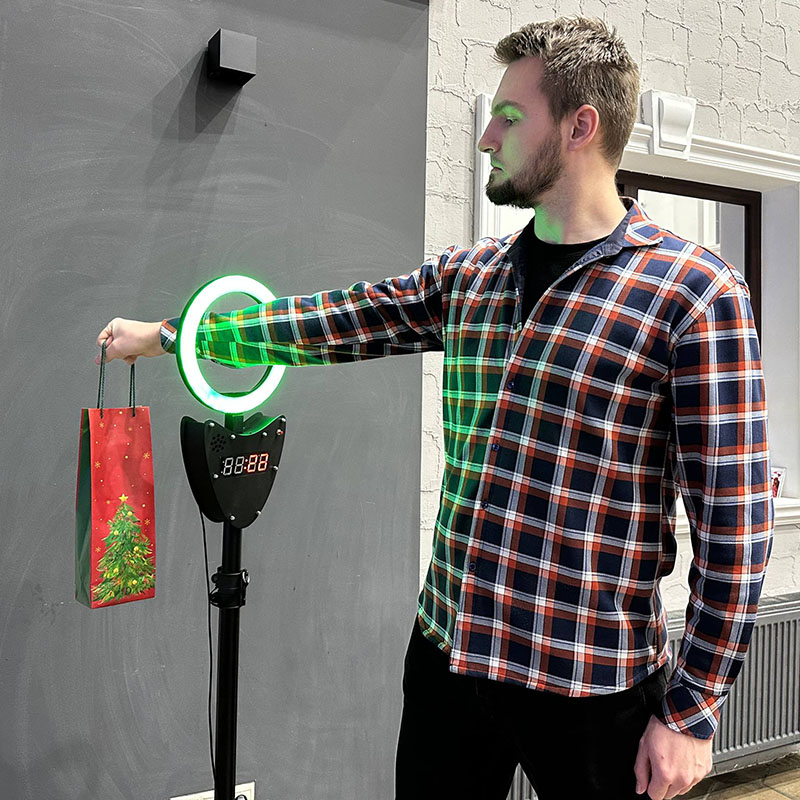 Участник подходит к стильной стойке с яркой круглой RGB‑лампой, в центре которой расположено отверстие.