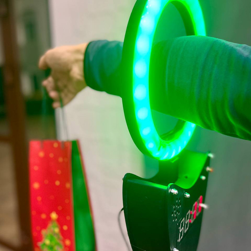 Протягивает руку сквозь отверстие — лампа загорается зеленым цветом, сигнализируя о готовности к старту.