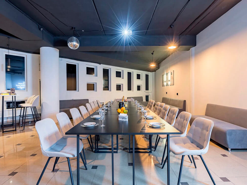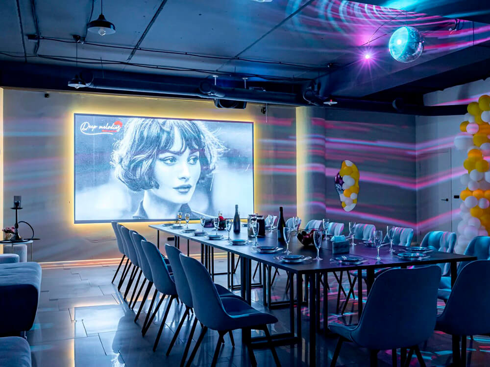 Vibes Loft Party — идеальное пространство для грандиозных праздников и свадеб, которые точно запомнятся вашим гостям! Просторная площадка площадью 75 м² вмещает до 50 человек и предлагает все необходимое для незабываемого торжества: 2 больших дивана, 8 столов, барная стойка, дискошар, фотозона, светомузыка, караоке, кальянная зона, профессиональный звук Dolby Audio и огромный экран. Красивая посуда, приборы и бокалы обеспечат комфорт и стиль.