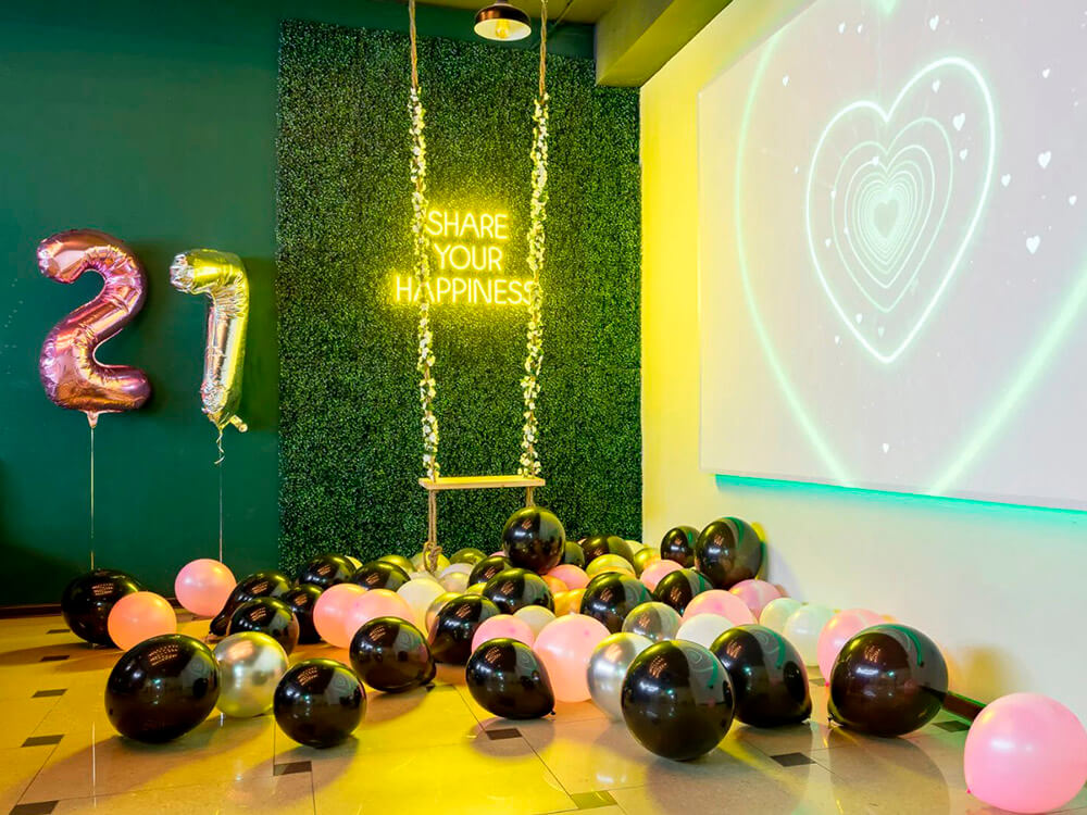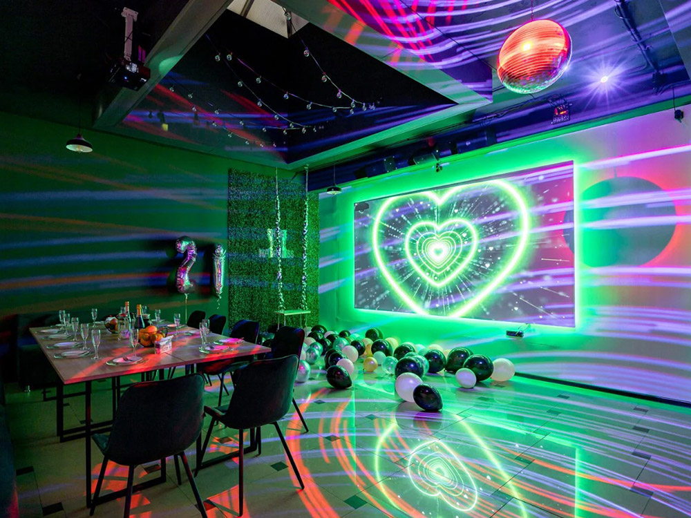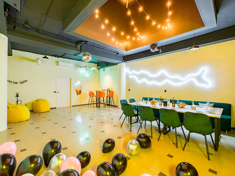 Vibes Loft Shine — это идеальное пространство для незабываемых вечеринок и танцев в Москве. Просторная площадка площадью 50 м² вмещает до 35 человек и предлагает все необходимое для создания атмосферы праздника: большой диван, 4 стола, сцена с караоке, кальянная зона, профессиональный звук Dolby Audio и огромный экран. Красивая посуда, приборы и бокалы обеспечат комфорт и стиль.