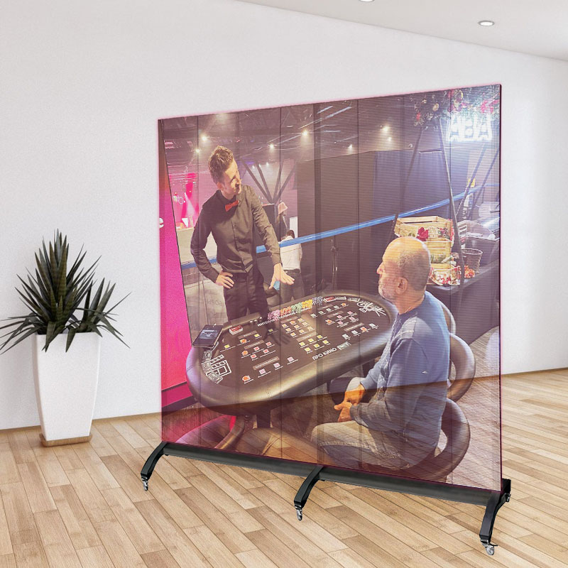 Видеопилон состоит из двух модулей размером 100×200 см каждый, которые в собранном виде создают впечатляющий медиафасад 200×200 см. Благодаря уникальной прозрачной структуре изображения словно парят в воздухе, не загораживая обзор и создавая завораживающий визуальный эффект.