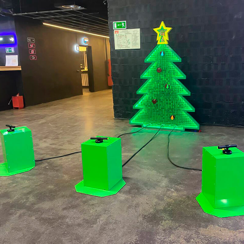 Проверьте праздничное настрой своих гостей, устройте соревнование на корпоративе с новогодним аттракционом Взрывная Ёлка в аренду. Здесь, в качестве ёлочных игрушек выступают надувные шарики, которые нужно как можно быстрее лопнуть. Для этого, у каждого из двух до пяти участников есть специальная «бум-машина» насос. Чтобы победить, нужно как можно быстрее качать воздух.