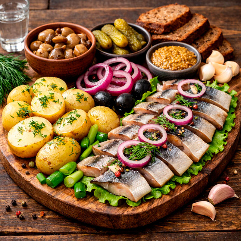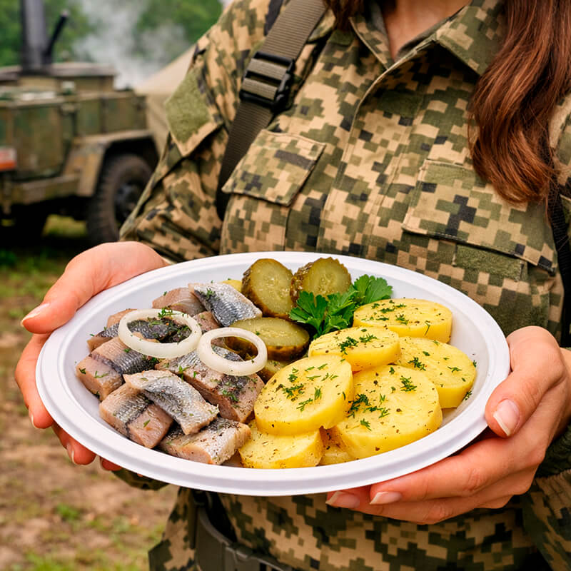 Капуста квашеная - хруст и лёгкая кислинка. Настоящая деревенская закуска к горячей каше. Селёдка с картофелем - нежное филе и отварной картофель. Свежие овощи - летнее настроение на столе. Эти простые, но душевные закуски сделают обед у полевой кухни по‑настоящему запоминающимся!