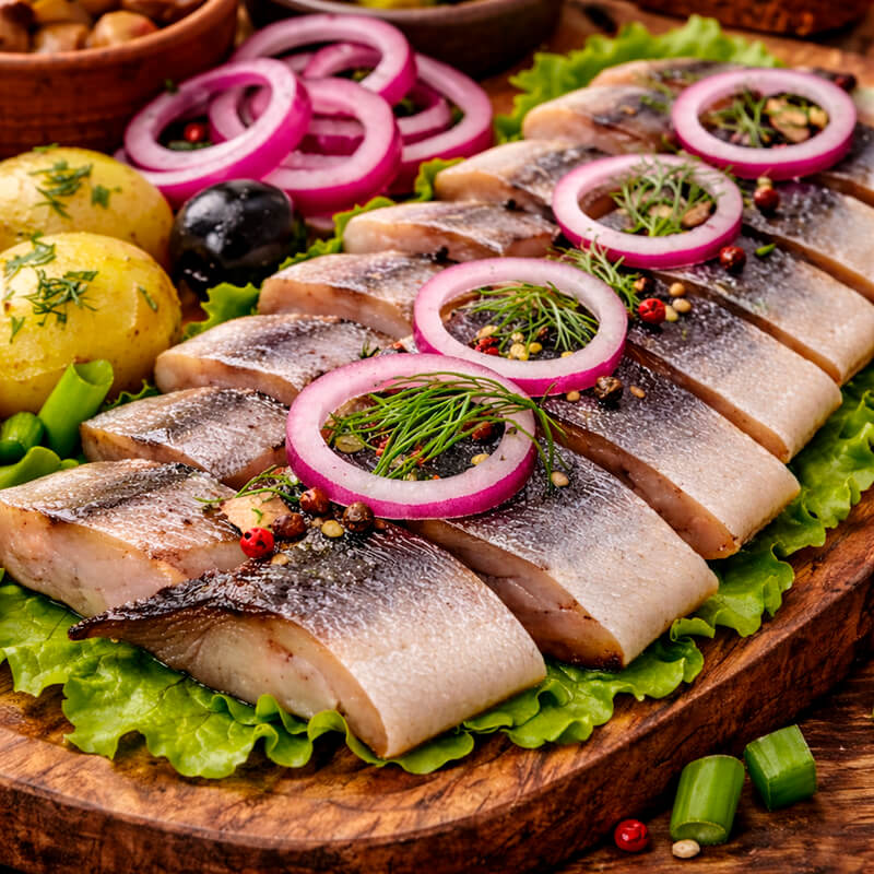 - Селедочка с картофелем: классическое сочетание нежного филе, отварного картофеля и лука.